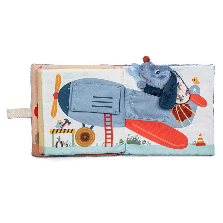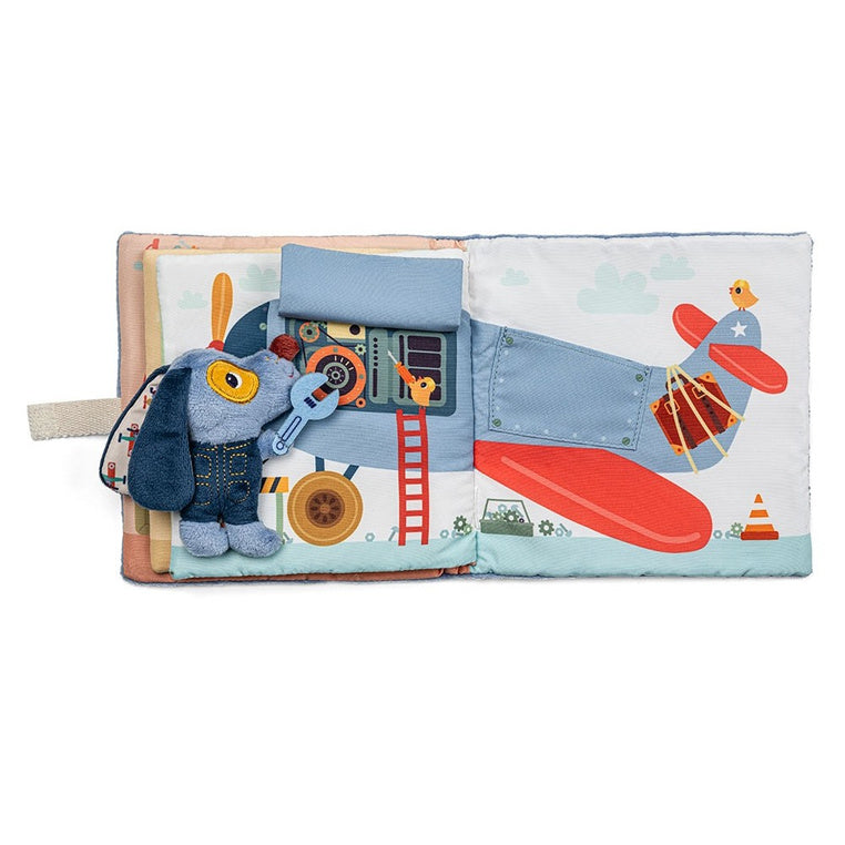 En extra attraktion är det prasslande omslaget, som omedelbart väcker barnets sinnen. Varje sida i häftet berättar en ny historia – en cykel, en traktor eller ett flygplan som repareras – och det hela förstärks av fickor och rörliga kardborreband.