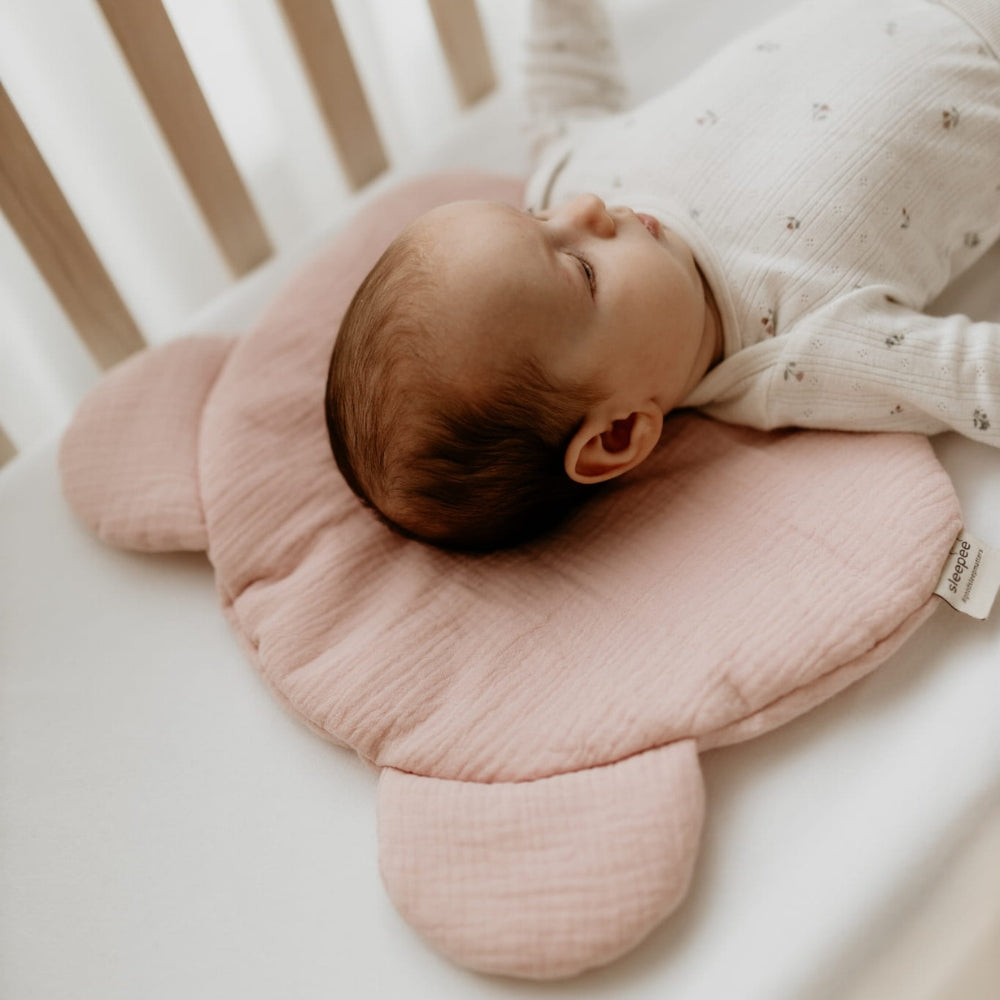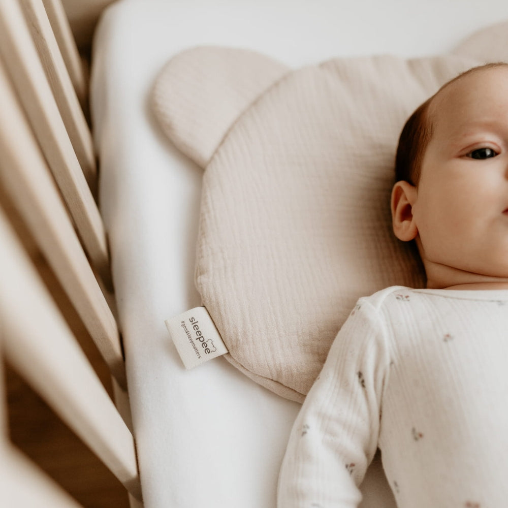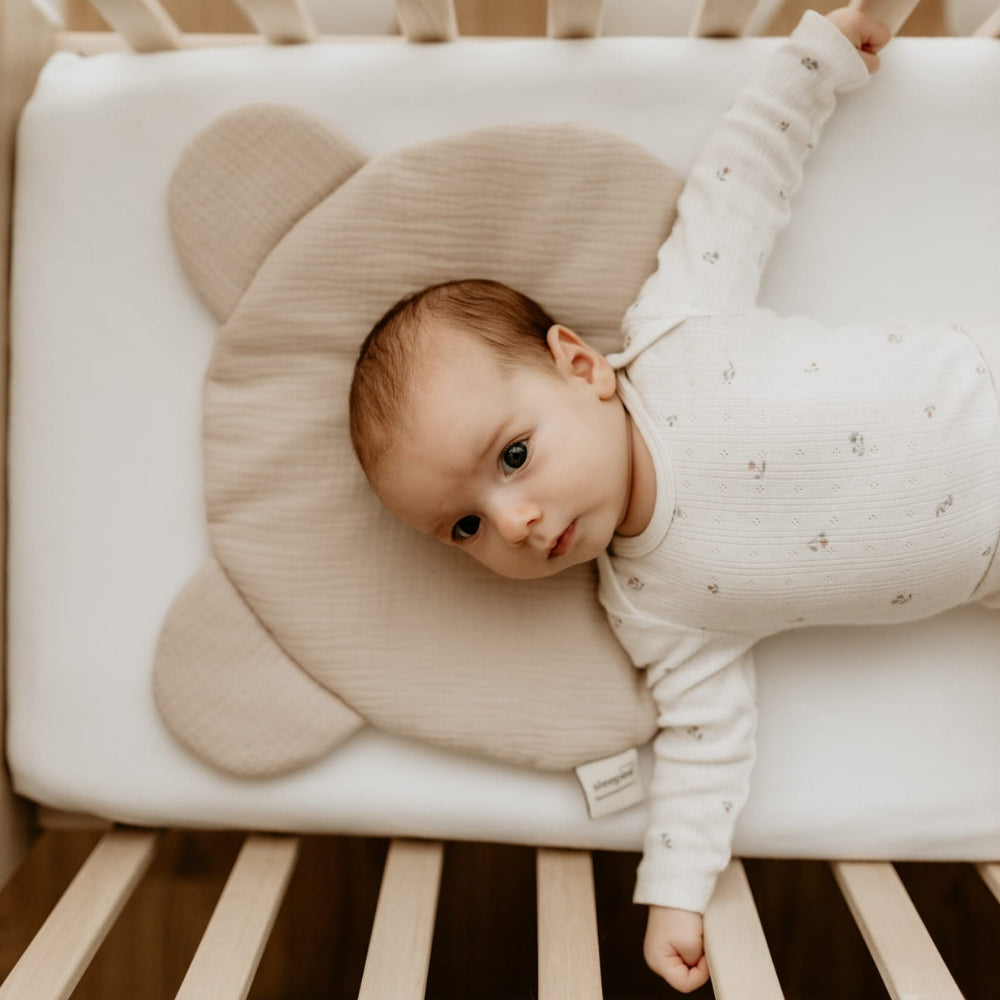 Sleepee-babykudden är tillverkad av muslinbomull och har formen av ett teddybjörns huvud.