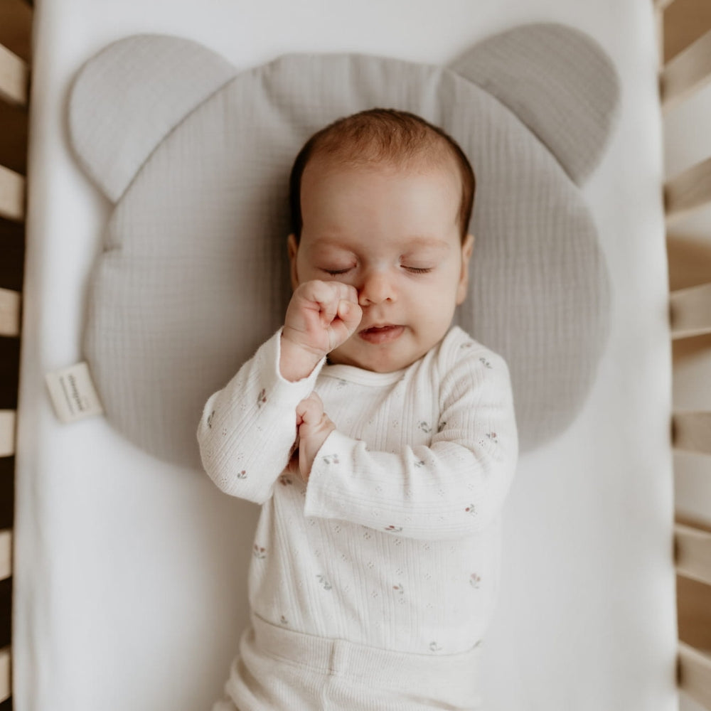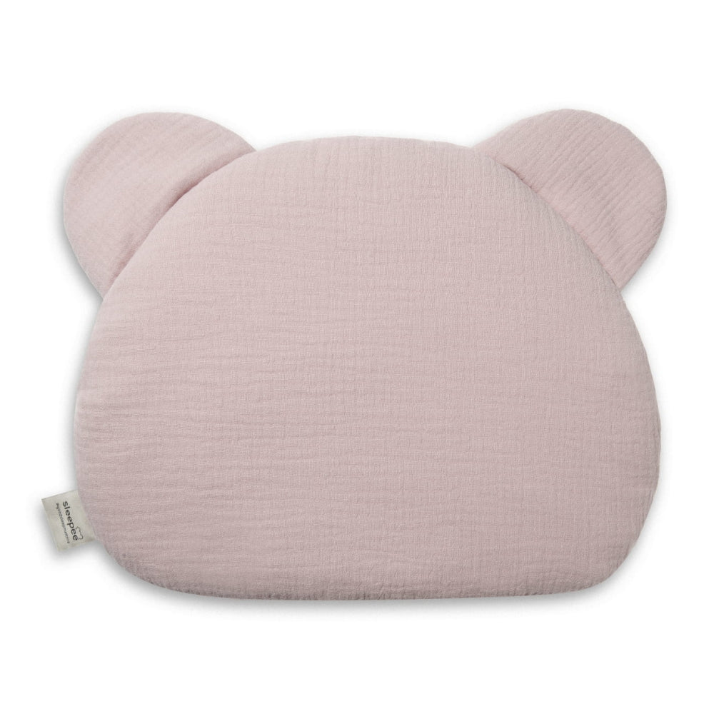 Sleepee babykudde är tillverkad av bomullsmuslin och har formen av ett nallehuvud.