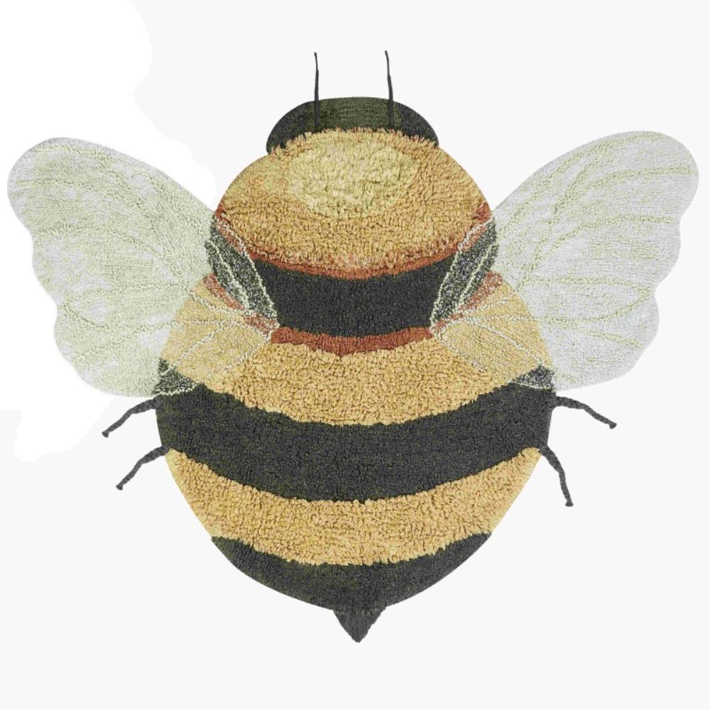 Barnmattan från Lorena Canals har designats med omsorg om detaljerna – dess honungsfärgade och mörkgrå randiga kropp och handgjorda, delikata vingar i en ljusblå nyans ger den en unik karaktär.