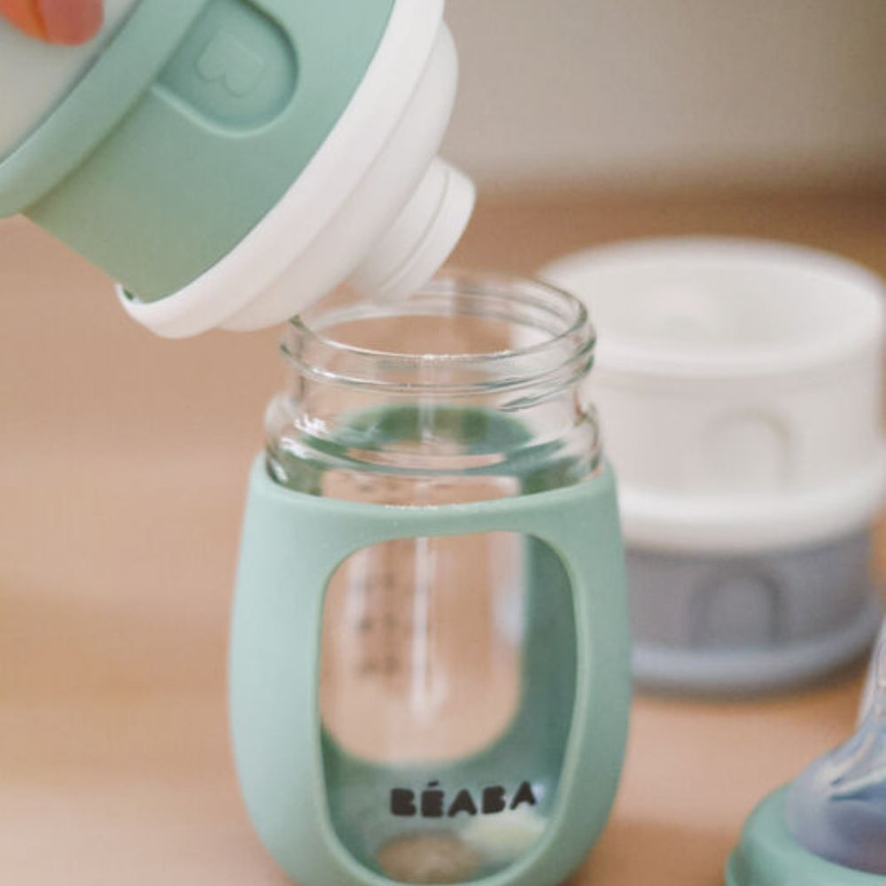 Behållarna för mjölkpulver i bomullsvitt/salvia är en extremt praktisk och kompakt uppsättning med 4 förvaringsbehållare för mjölkpulver från Beaba.
