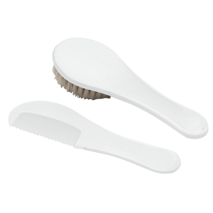 Hårborsten är gjord av naturliga borst som är skonsamma mot barnets huvud, och en kam ingår också.