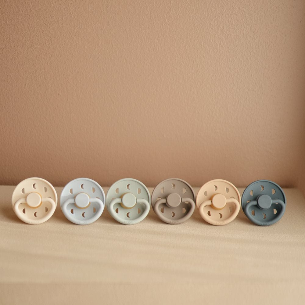 Gumminappen Moon Rubber Croissant Baby Pacifier Size 1 från Frigg är perfekt för både pojkar och flickor.