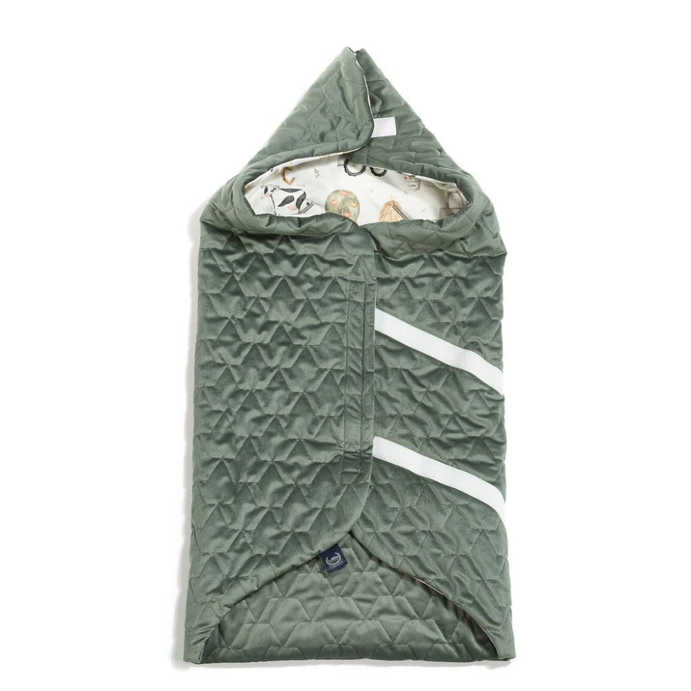 En extremt praktisk filt som enkelt fästs med kardborreband för att skapa en huva som skyddar ditt barns huvud.