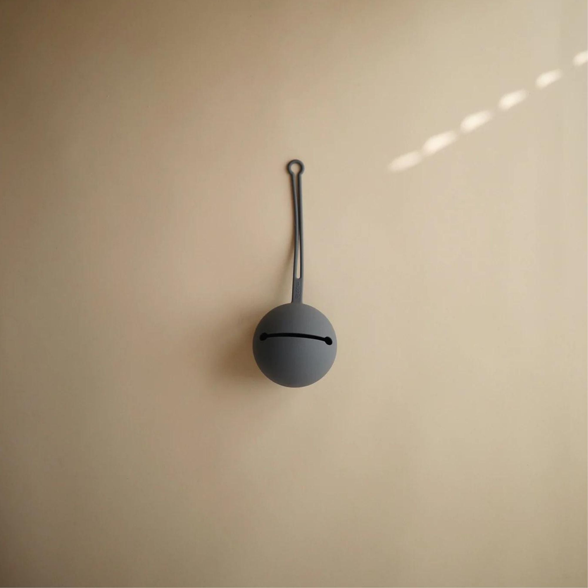 Ball Tradewinds napphållare för barnvagn från varumärket Mushie har en speciell fästanordning med vilken den kan fästas på barnvagnen, spjälsängen eller någon annanstans.