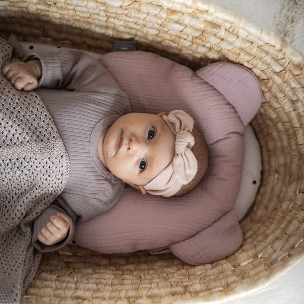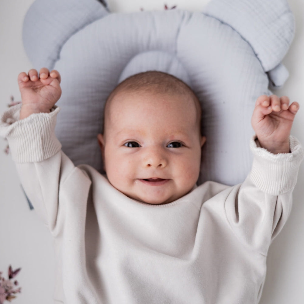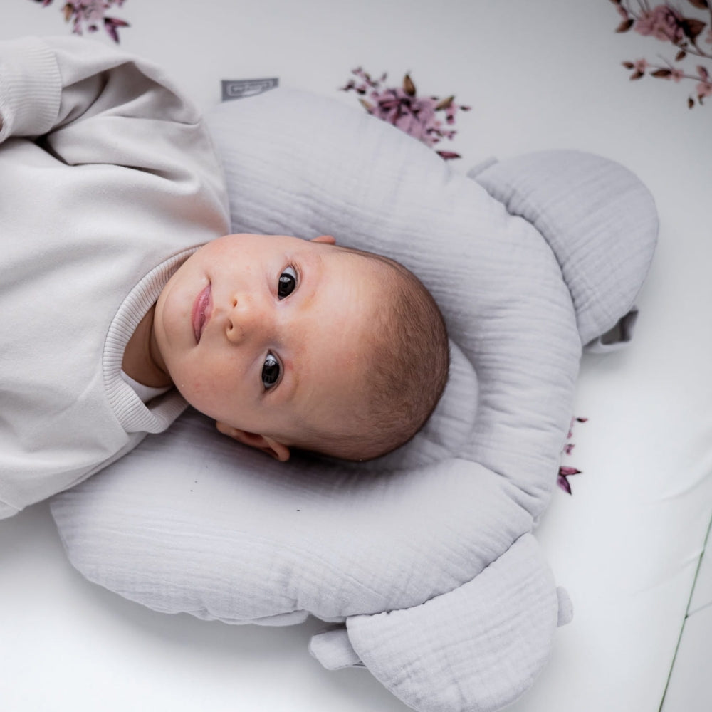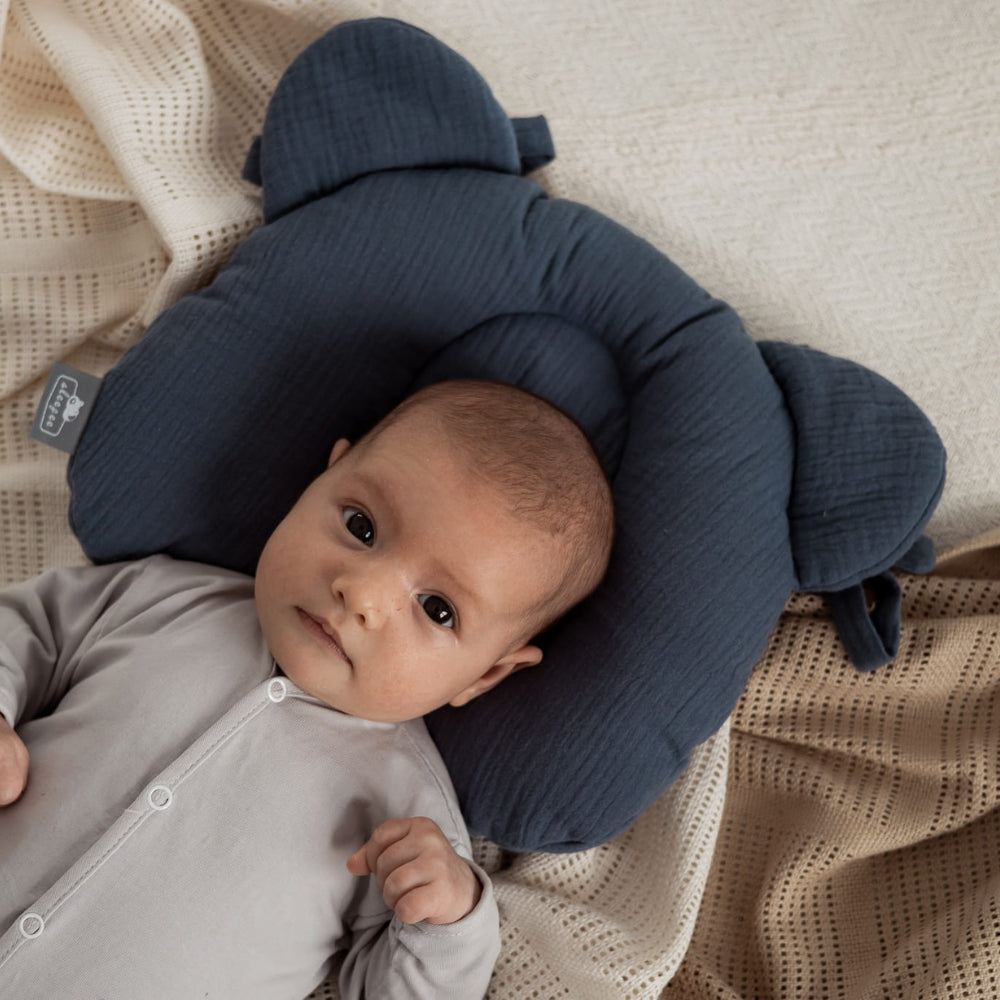 Sleepee-spädbarnskudden är tillverkad av mjuk bomullsmuslin och är formad som ett nallehuvud.