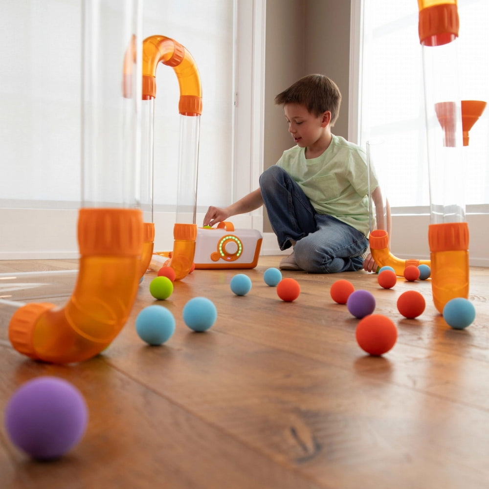 Du kan ordna rören och kopplingarna i olika konfigurationer, experimentera med att skapa slingor och svängar, placera rören under ett bord eller över en stol.