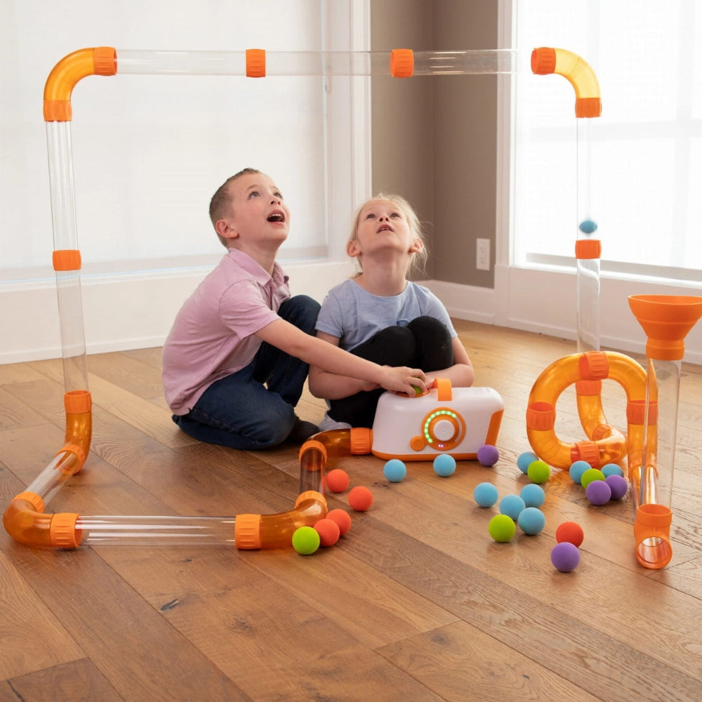 Air Toobz är en barnsäker blåsmaskin som kastar färgglada EVA-skumbollar genom en labyrint av rör som kan arrangeras efter önskemål.