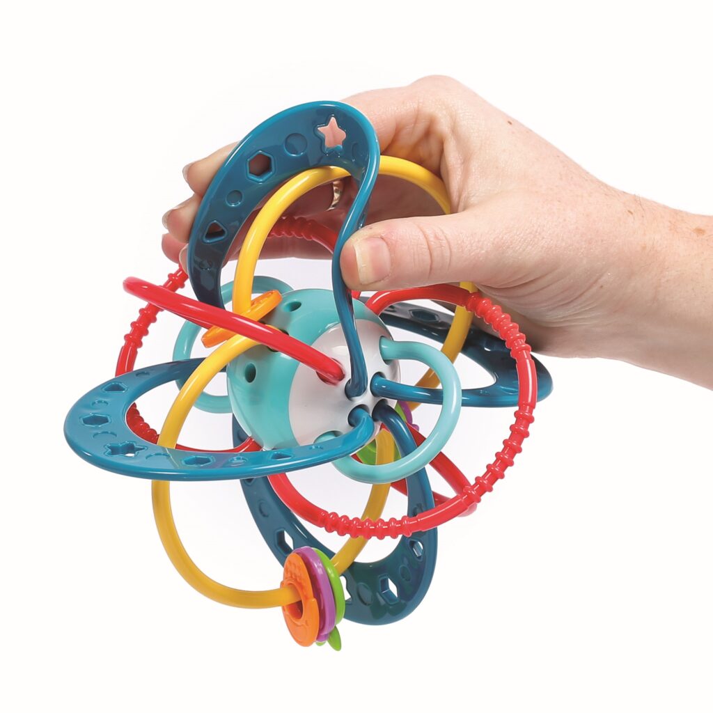De mjuka och färgglada ringarna, inspirerade av planeternas ringar, tål att tuggas på och lindrar tandköttet hos småbarn som håller på att få tänder.