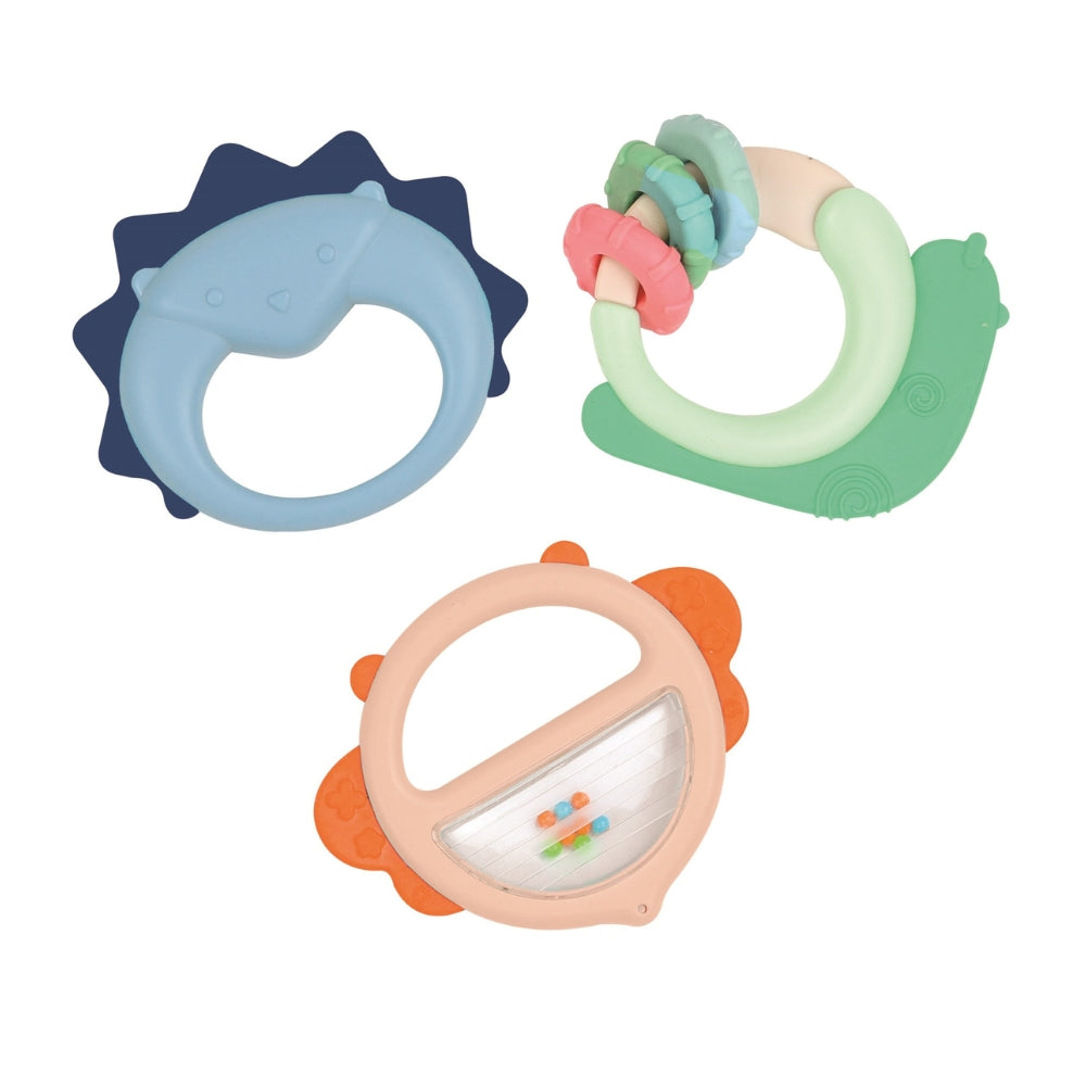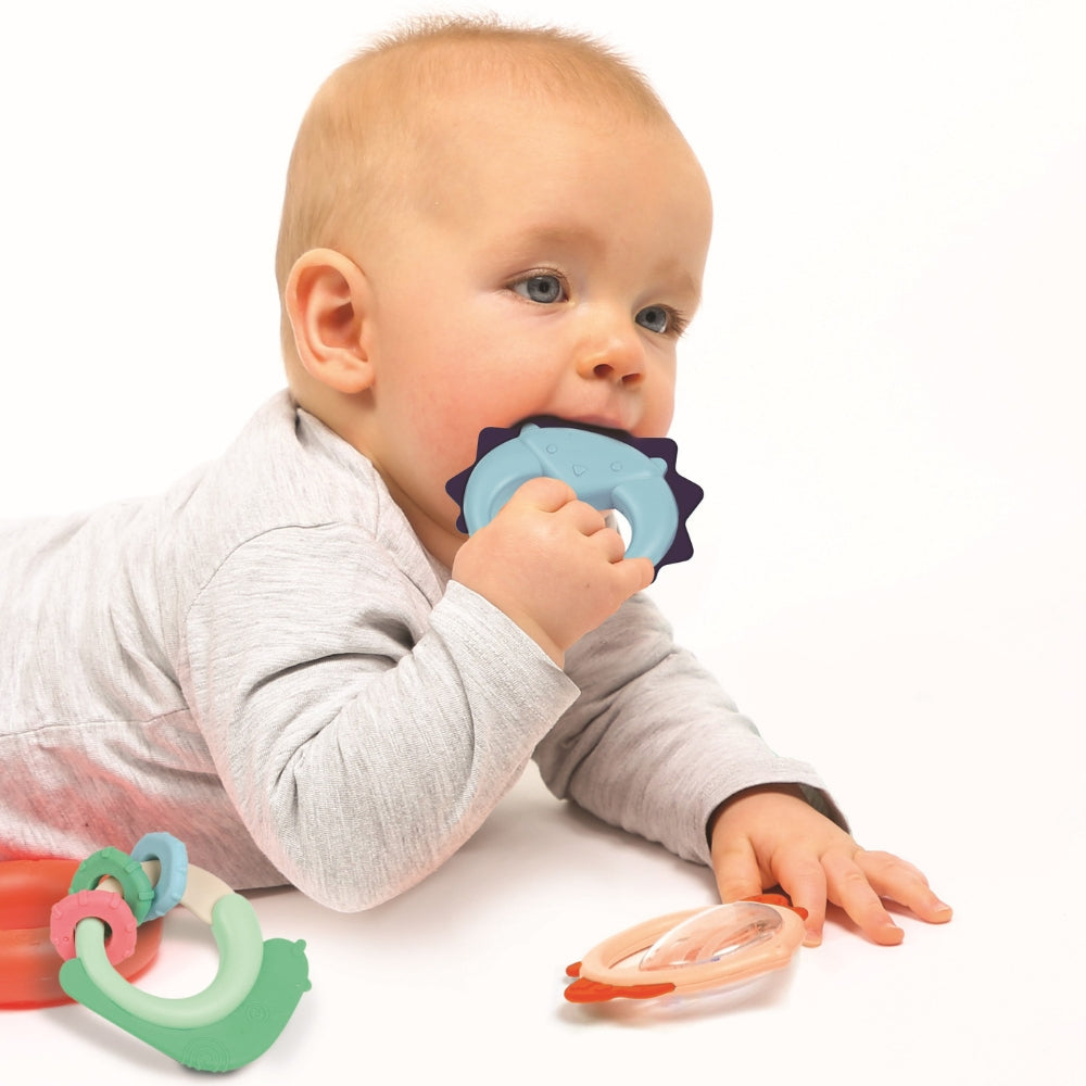 I Ludi Teething Set hittar du tre bedårande former inspirerade av vänliga djur: en igelkott, en snigel och en fjäril – i perfekt storlek för barnets små händer.