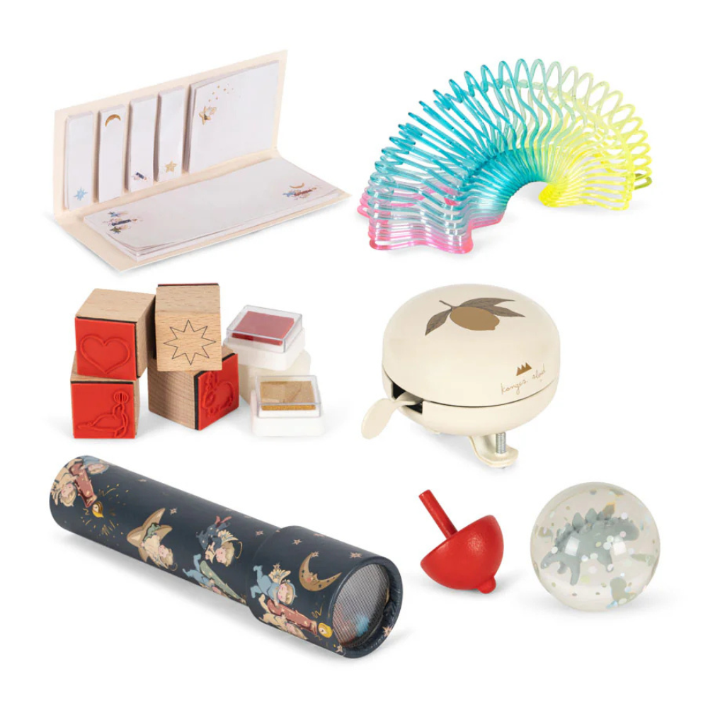 - Setet innehåller: jultatueringar, en liten nallebjörn, en aktivitetsbok (20 sidor), 12 metalliska kritor, ett kalejdoskop, en magisk fjäder, tatueringspennor med schabloner, klistermärken, en snurra, kortspelet "Black Cat", studsboll, minnesspel (30 delar), fönsterklistermärken (2 ark), cykelklocka, målarbok A5 (20 sidor), stämplar, dekoration, dekorativa småstenar, 4 magiska pennor, anteckningsbok, minipussel, fönstermarkörer (2 st.), linjal och glitterpennor