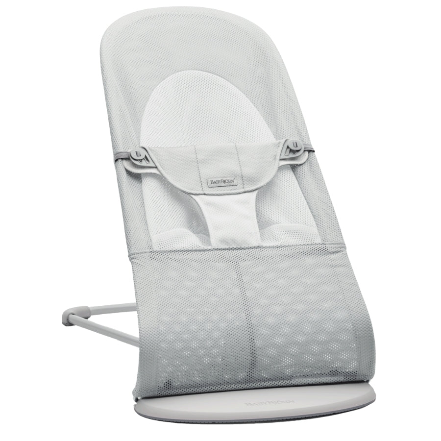 Bliss Mesh babysitter i silver och vitt med ljusgrå ram är den första babysittern för ditt lilla barn från det välkända varumärket Babybjorn
