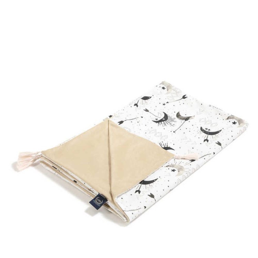 En exceptionellt mjuk och delikat dubbelsidig babyfilt från La Millou i färgen Sand med det vackra Bright Luna-mönstret.