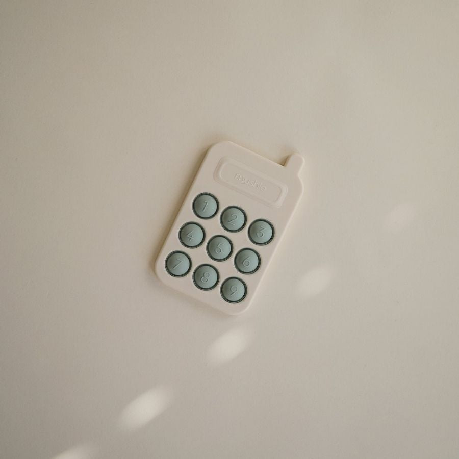 Leksaken Cambridge Blue pop up phone från Mushie är en unik sensorisk leksak för barn från 10 månaders ålder.