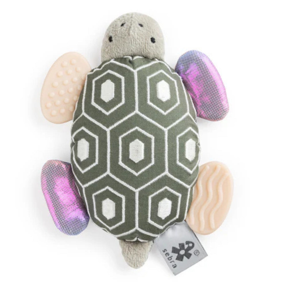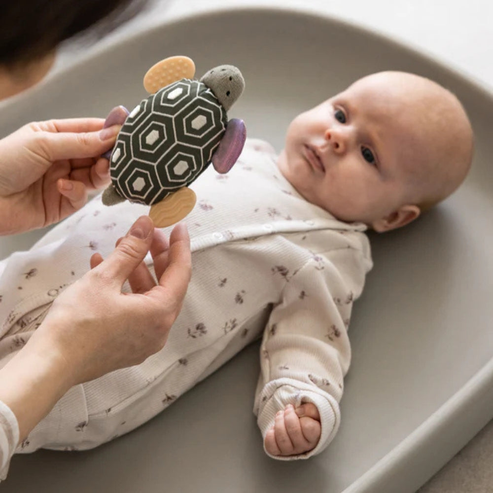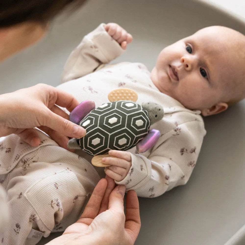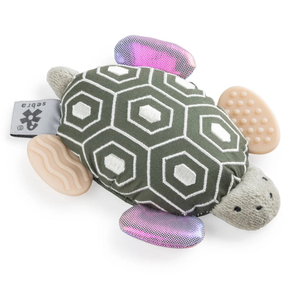 Sebra babyrassel är designad i Danmark med stor uppmärksamhet på detaljer. Två av sköldpaddans tassar är gjorda av material med holografisk effekt, medan de andra två har utskjutande delar och knölar, perfekta för att massera ömma tandkött under tandväxlingen. Inuti leksaken döljer sig ett subtilt skramlande element som uppmuntrar barnet att greppa och röra leksaken.