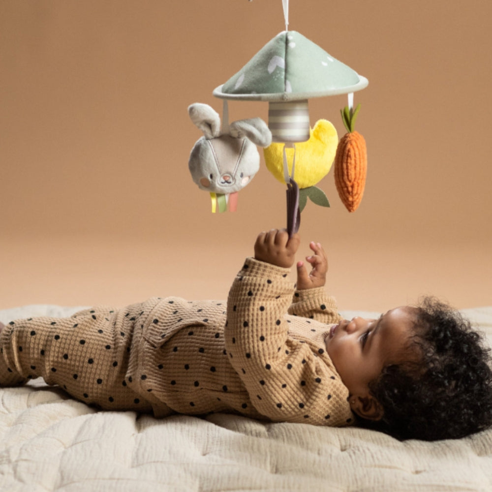 Den innehåller en mängd olika element, såsom den bedårande kaninen Rylee, hängande morötter och tulpaner som hänger från den gröna baldakinen och uppmuntrar barn att utveckla sin visuella följförmåga.