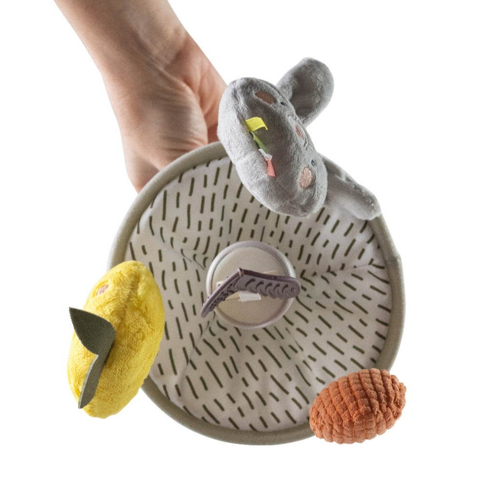 Karusellen har också en klocka och en bladformad bitring som låter de små utforska världen omkring sig.