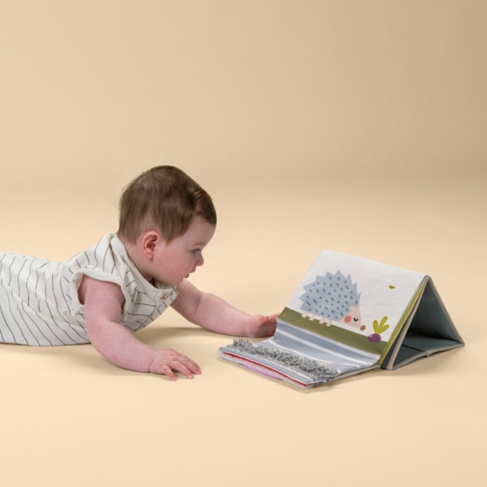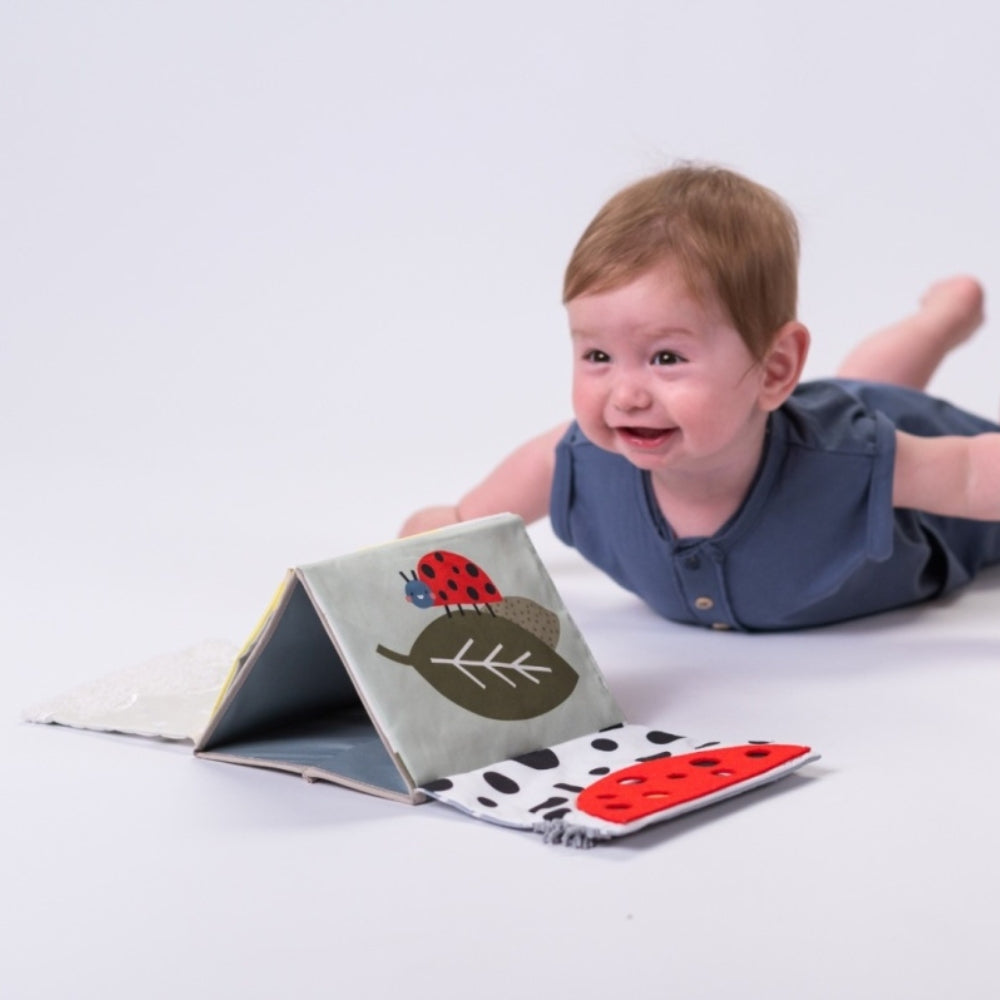 Med sin smarta design och varierade stimuli uppmuntrar denna dubbelsidiga bok barnet att ligga på magen, stöder utvecklingen av syn, hörsel och känsel och stimulerar nyfikenheten på omvärlden.