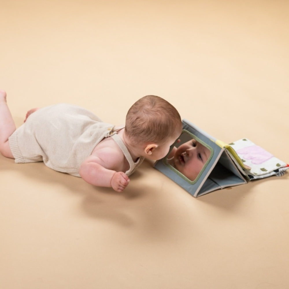 Den inbyggda spegeln motiverar barnet att lyfta huvudet och utforska sitt eget ansikte, vilket bidrar till utvecklingen av nack- och överkroppsmusklerna.