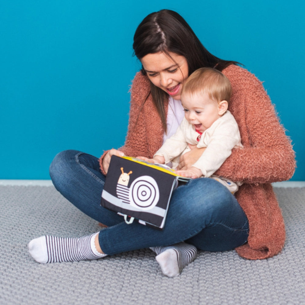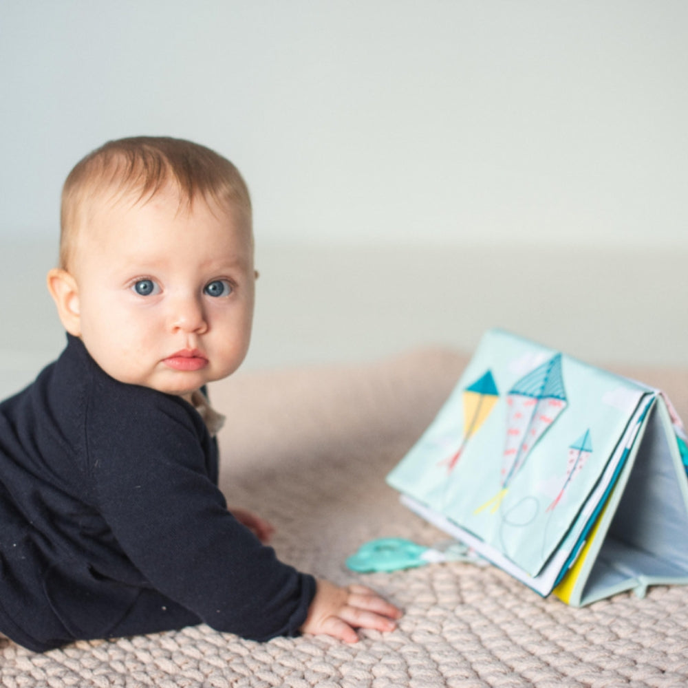 En mjuk taf toys interaktiv bok för bebisar, med två sidor för två utvecklingsstadier, för användning i barnsäng, barnvagn och för lek vid mage.