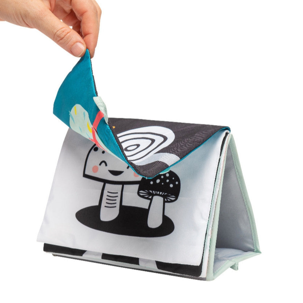 Den interaktiva boken från taf toys har en babysäker spegel och skrynkliga texturer, samt 3D-aktiviteter och texturerade tyger.