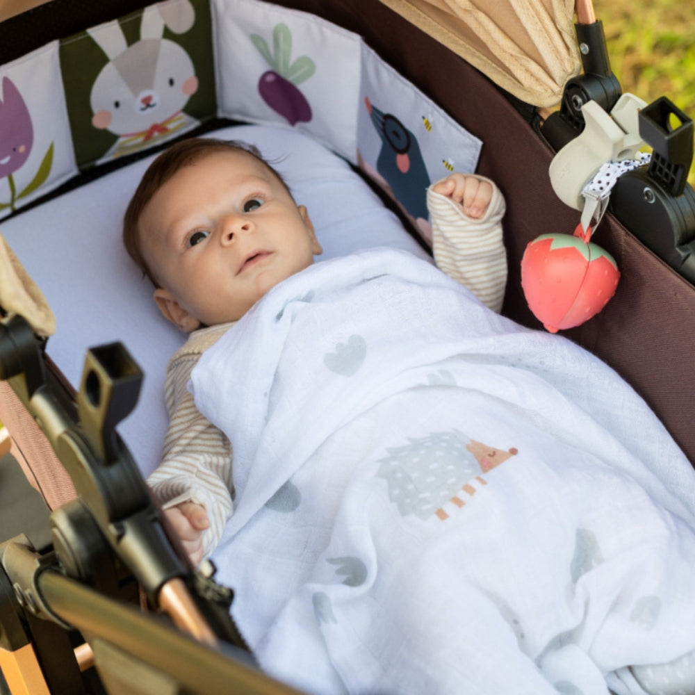 Den dubbelsidiga barnvagnsboken stimulerar barnets syn och känsel.