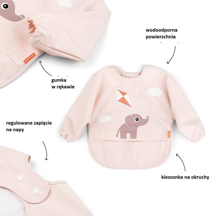 Haklappen med ärmar har utformats så att ditt barn kan njuta av maten utan att kläderna blir smutsiga.