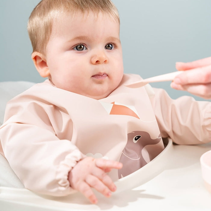 Denna haklapp med ärmar från Done By Deer är perfekt för barn i åldern 6–18 månader.