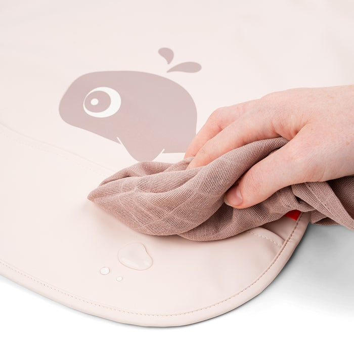 Sone By Deer-haklappen är vattentät, och den broderade PU-polyestern gör det enkelt att rengöra haklappen med en fuktig trasa eller under rinnande vatten.