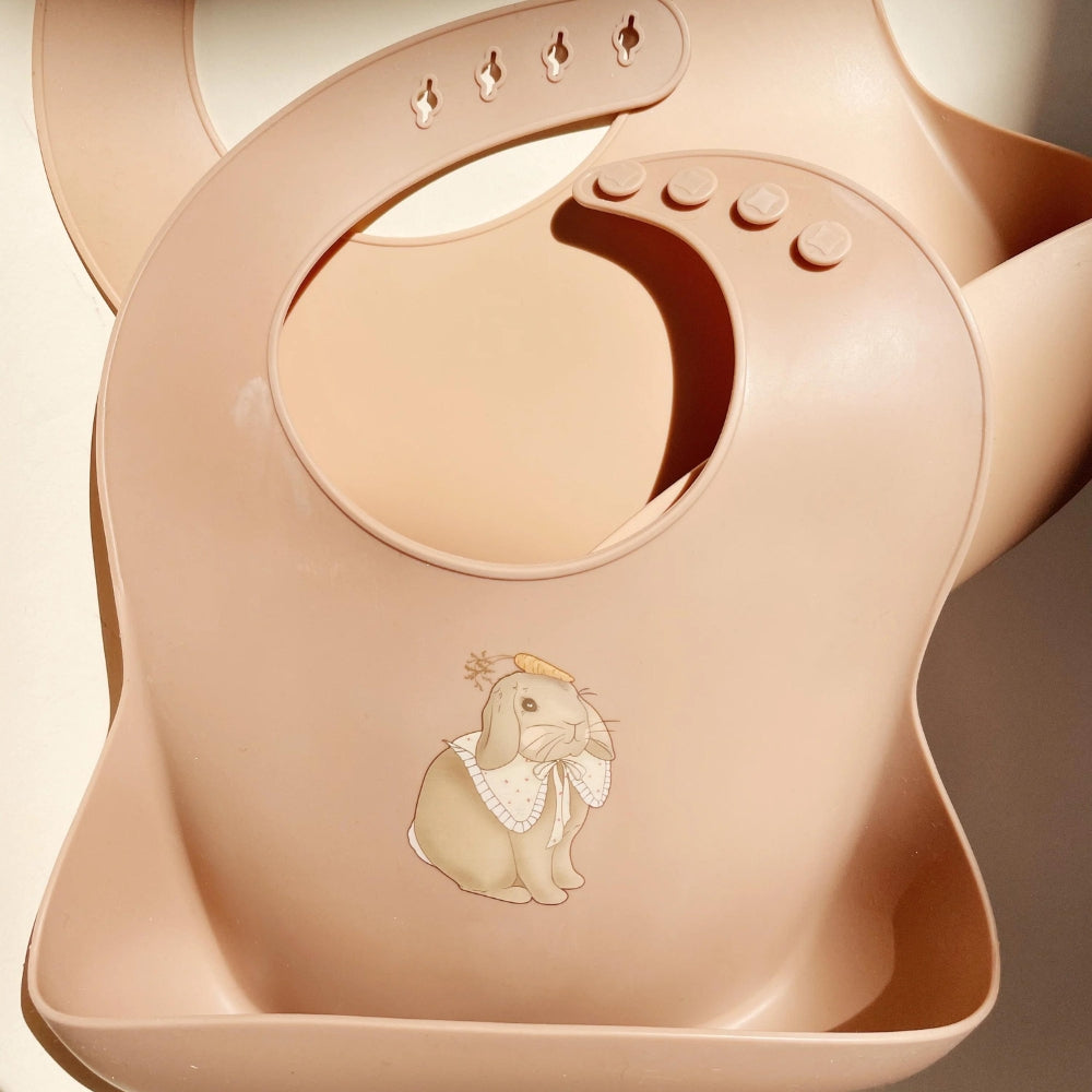 Setet innehåller 2 haklappar med ett gulligt kaninmönster.