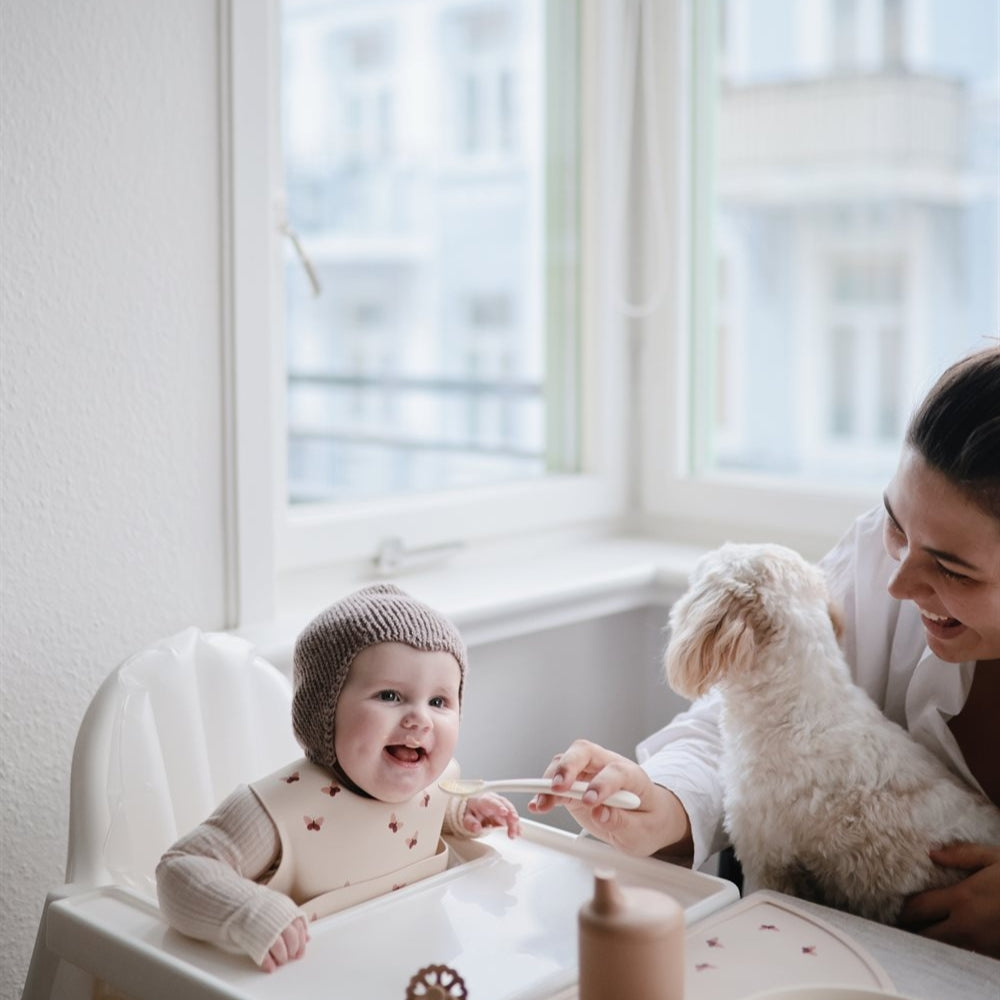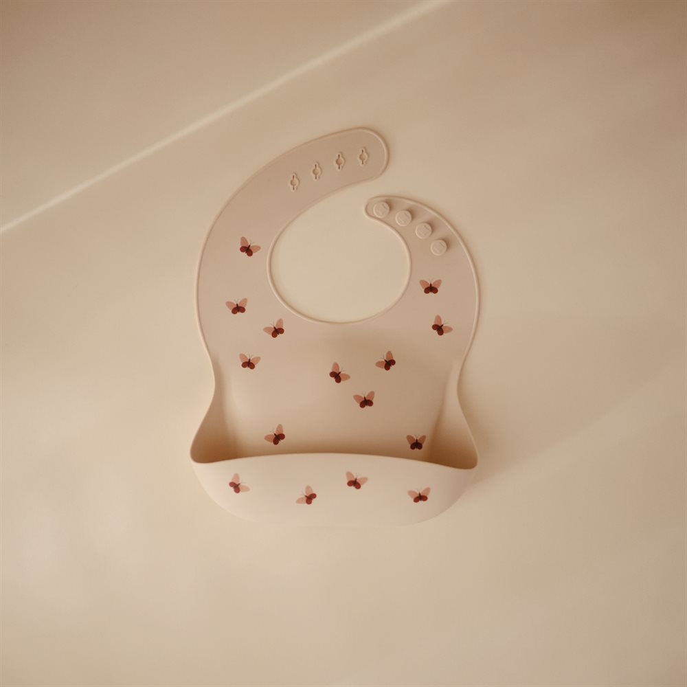 Mushie Silicone Bib Butterflies är en fantastisk silikonhaklapp med en klassisk design och ett tidlöst utseende.