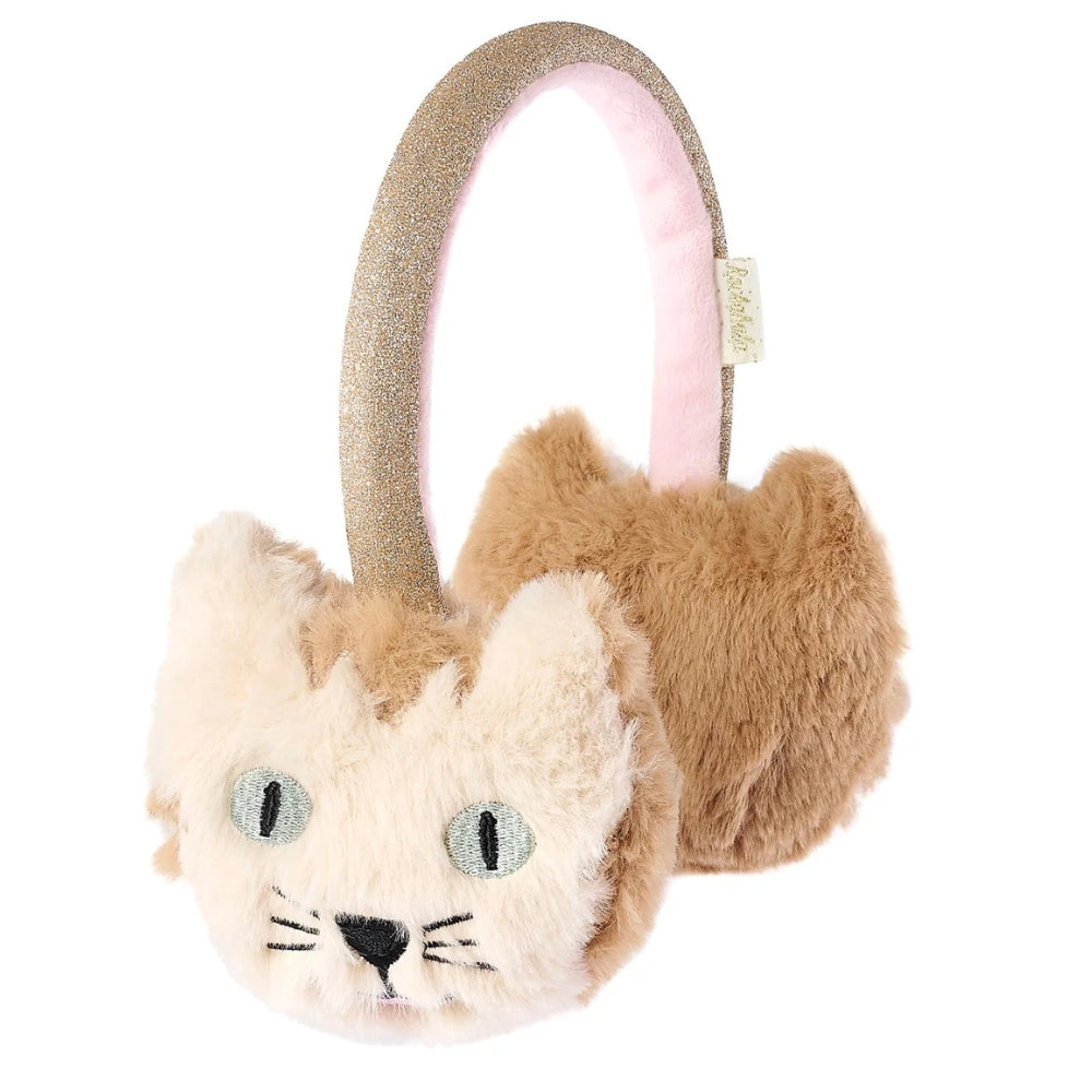 Det guldglittrande huvudbandet ger en speciell touch, och det broderade kattansiktet med söta morrhår och ränder gör Rockahulas öronmuffar iögonfallande och får en att le.