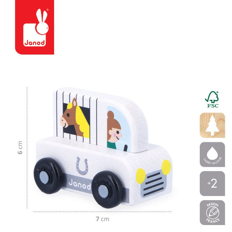Träfordonet Horse Country från serien Cross Roads från Janod är ett utmärkt komplement till mattan-mattan "City" från samma kollektion, men fungerar också bra som ett fristående leksak för små bilfantaster.