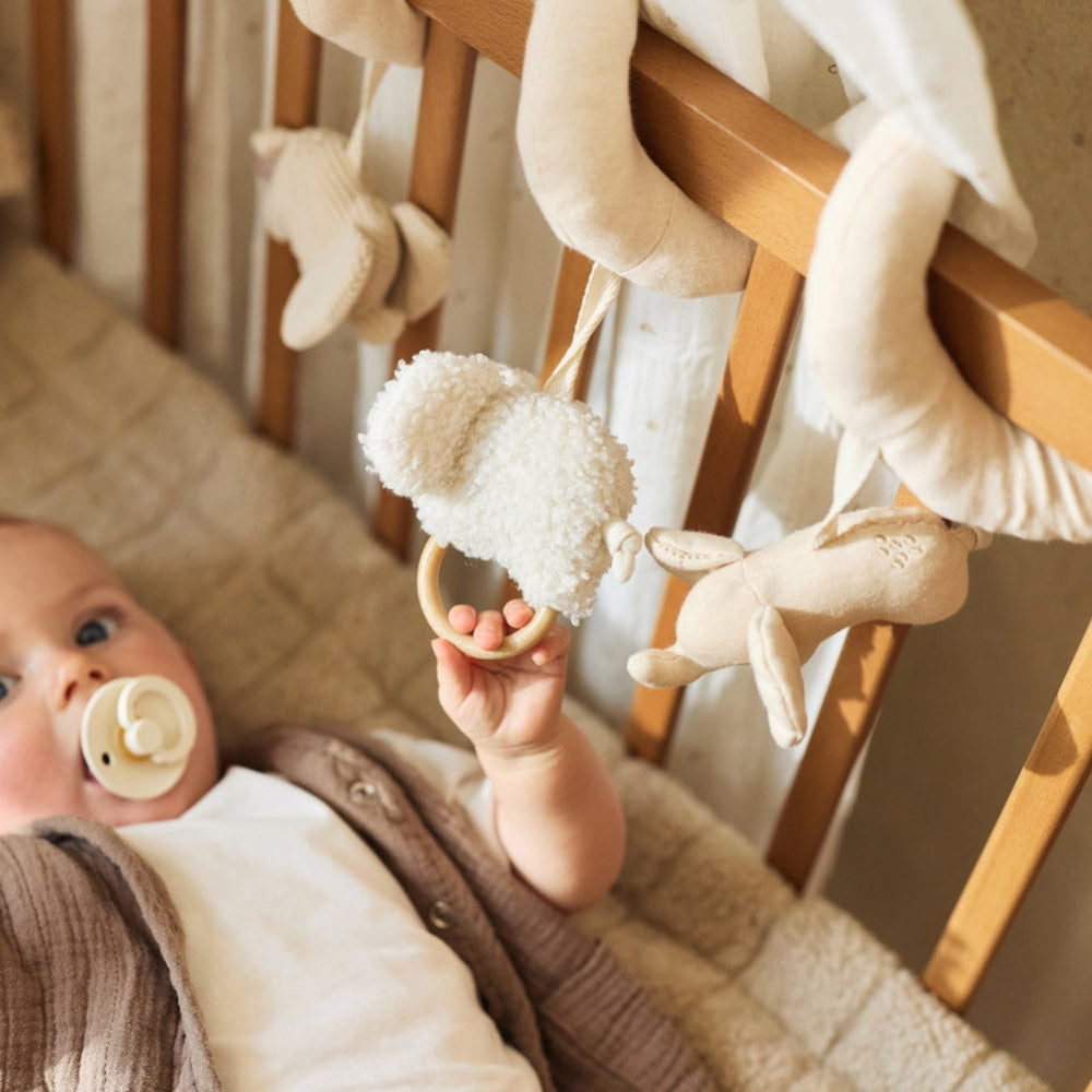 Varumärket Jollein har skapat en produkt som kombinerar funktionen av en sensorisk leksak med den av ett praktiskt tillbehör för vagnen eller barnsängen.