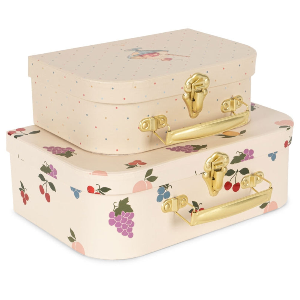 Detta charmiga set med två resväskor i kartong gör att du enkelt kan organisera leksaker, prydnadssaker och minnessaker, samtidigt som de utgör ett vackert dekorativt inslag i ditt barns rum.