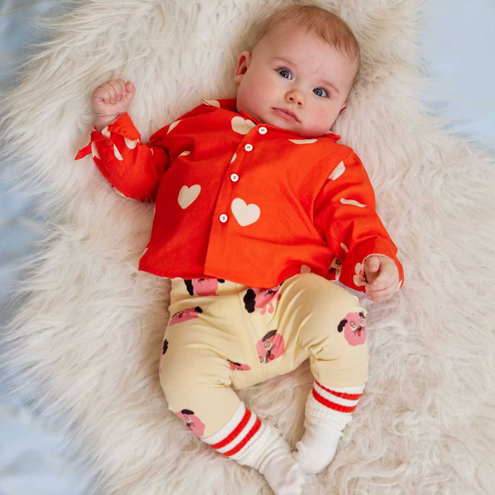 Hundmönstret i typisk Mini Rodini-stil ger karaktär åt hela looken och gör byxorna perfekta för vardagsstyling, dagis eller utflykter.