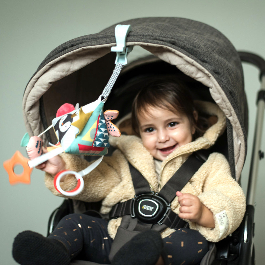Leksaken kan lossas från klämman och på så sätt kan barnet leka med den som med en nallebjörn.