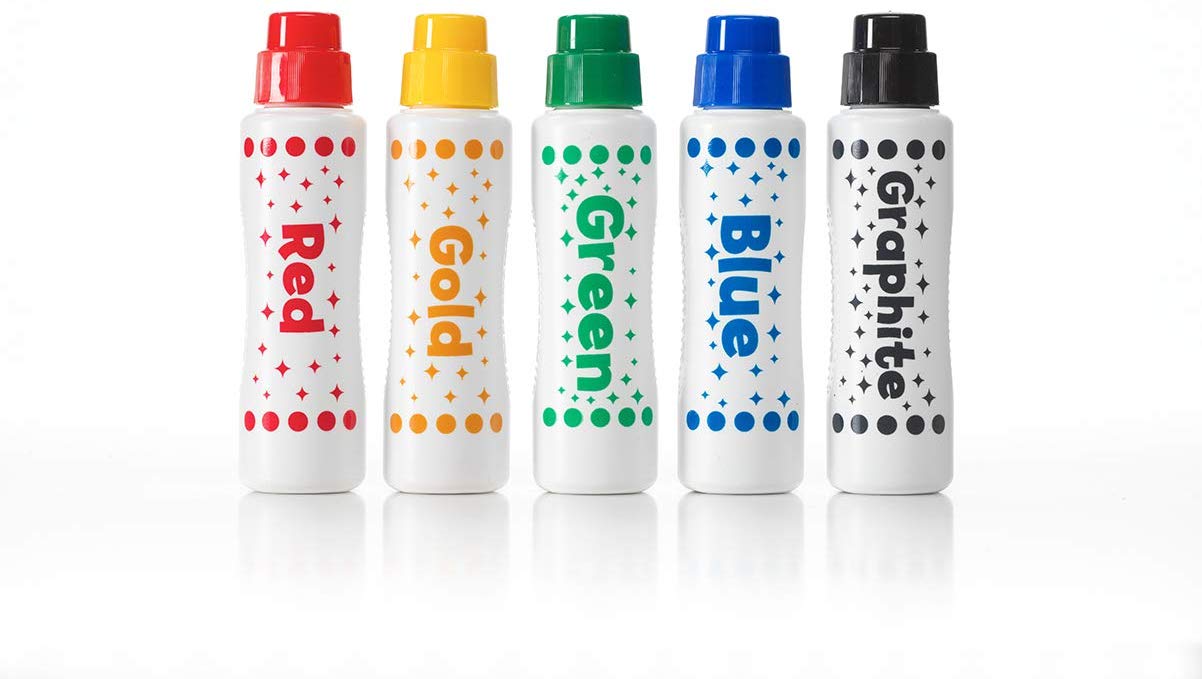 Do-A-Dot Arts prickmarkörer är tvättbara flytande färger i stora flaskor, perfekt anpassade för barns små händer.