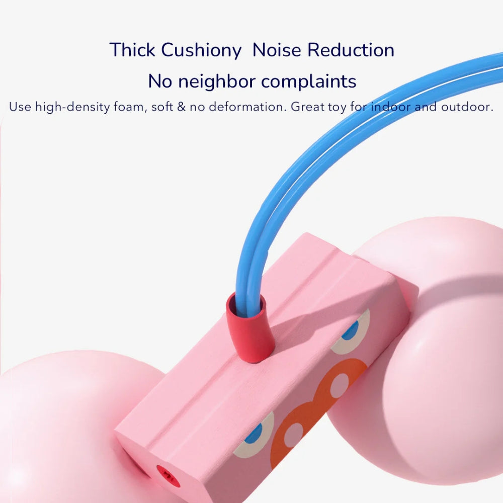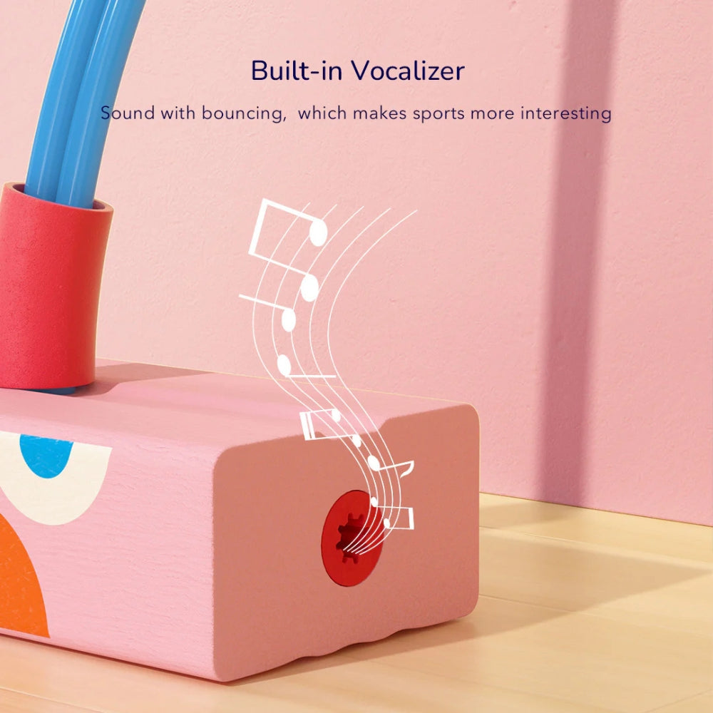 Dessutom förhindrar pedalens korrugerade yta att fötterna glider, och det lekfulla ljudet från pipan vid varje hopp väcker entusiasm och uppmuntrar barnet att fortsätta aktiviteten.