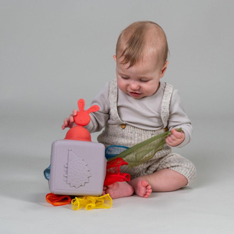 - Behållarens innehåll interaktivt kaninhuvud för att dra och trycka på, sensorisk igelkottssida, stort hål för att stoppa in näsdukar, 3D-blomma för taktil lek, nät sida för att dra i, 9 färgglada organza-tyger.