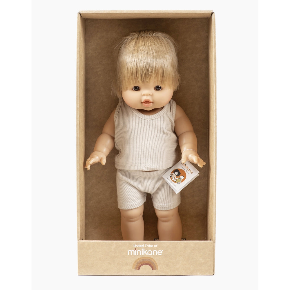 Archie babydocka har bruna ögon och kort blont hår som doftar vanilj.