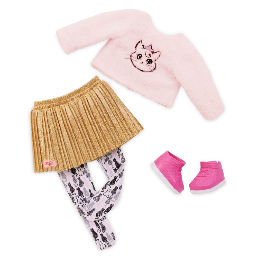 - I setet ingår: 46 cm docka, plyschblus med kattunge-motiv, plisserad blank kjol, kattunge-strumpbyxor, underkläder, skor, tecknad katt, dekorativt halsband med rosett, 2 burkar kattmat, boll, leksaksfisk, kam och klo-tassar