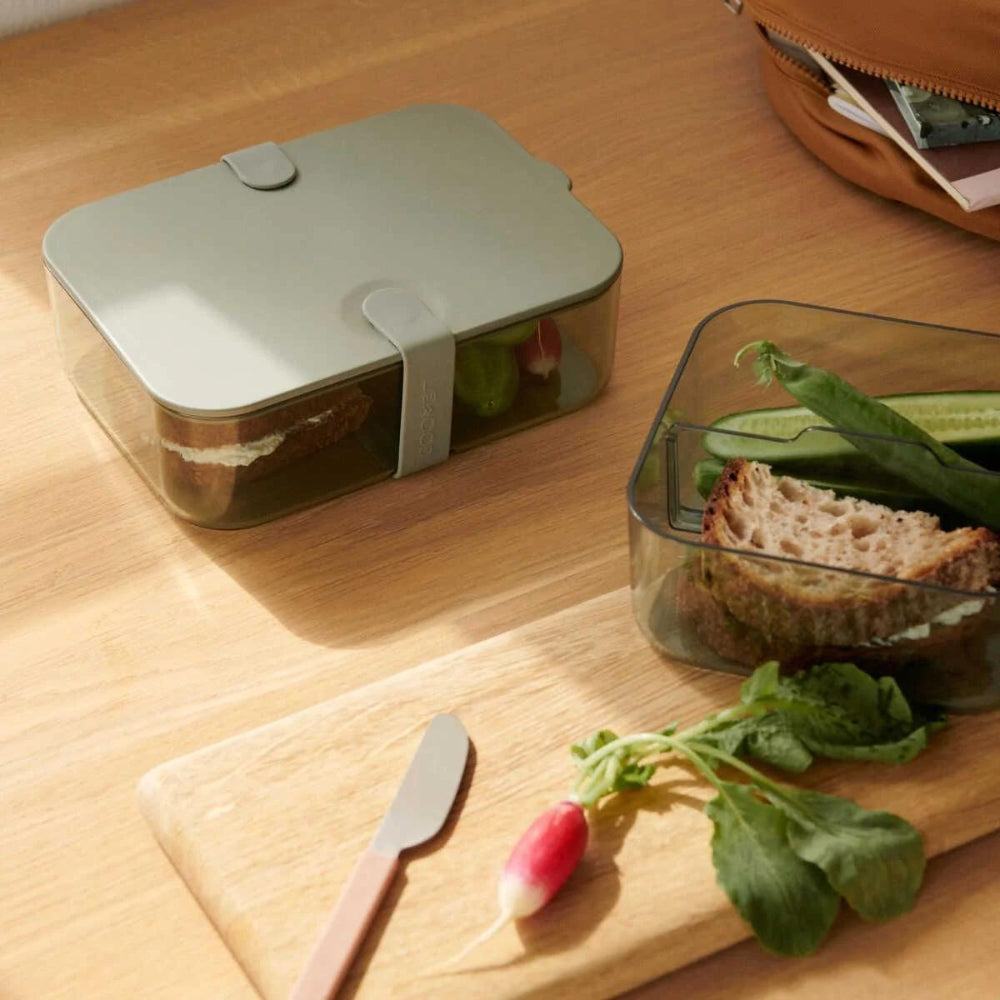 Lunchlådan för skolan från Liewood har ett silikonlock i grönt.