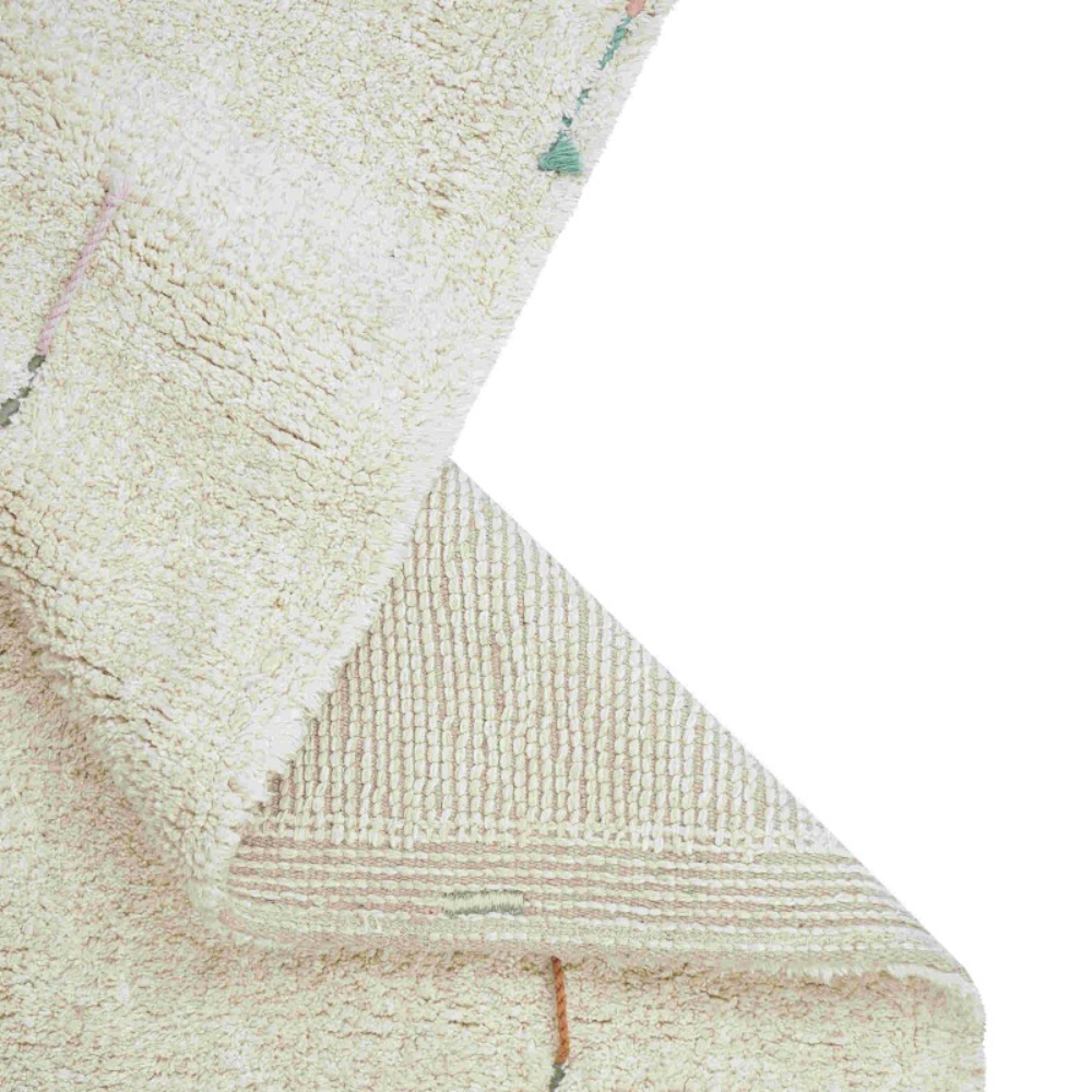 Mattan från Lorena Canals är tillverkad av en mjuk bomullsblandning i naturliga nyanser och är dekorerad med broderade färgglada snören runt kanterna och symmetriska mönster som bidrar till dess charm.