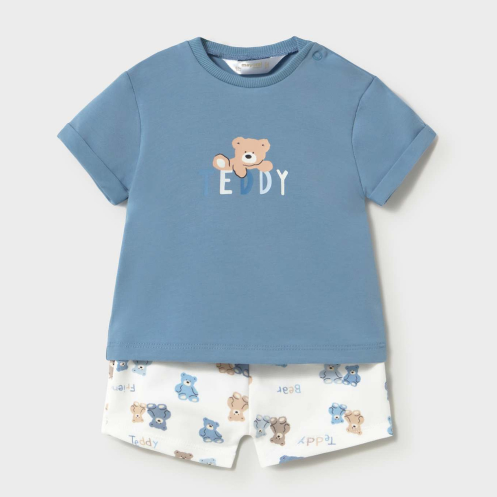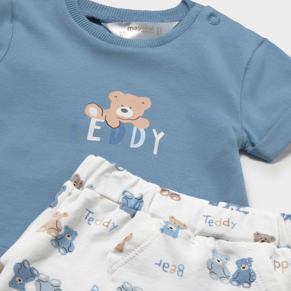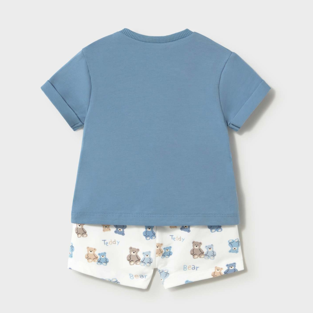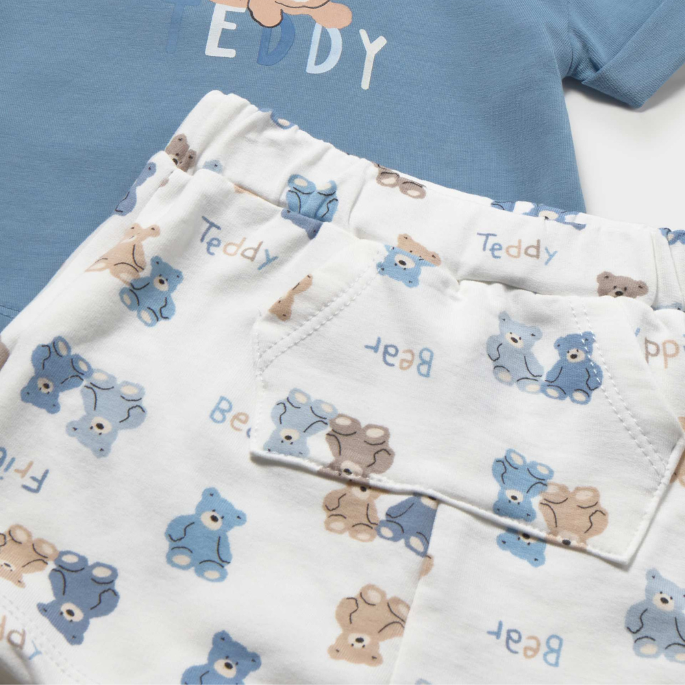 Setet består av en kortärmad T-shirt i en delikat blå färg och korta shorts i en ljus nyans med ett upprepat teddybjörnsmotiv.