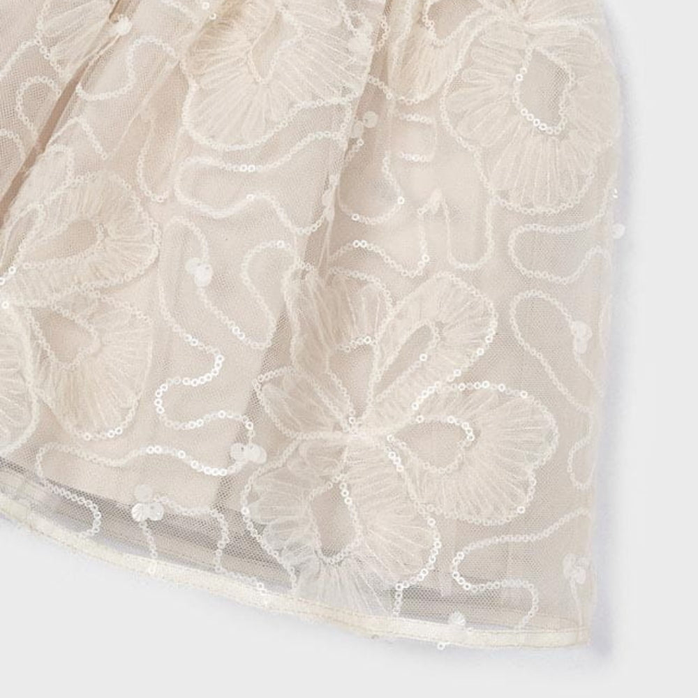Das Modell der Marke Mayoral begeistert mit einer cremefarbenen Farbe und luftigem Tüll, der sich bei Bewegung schön anordnet.