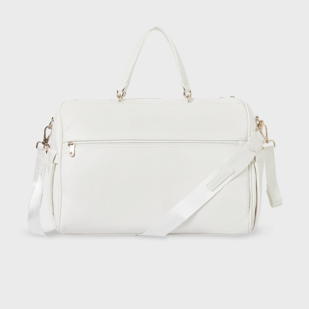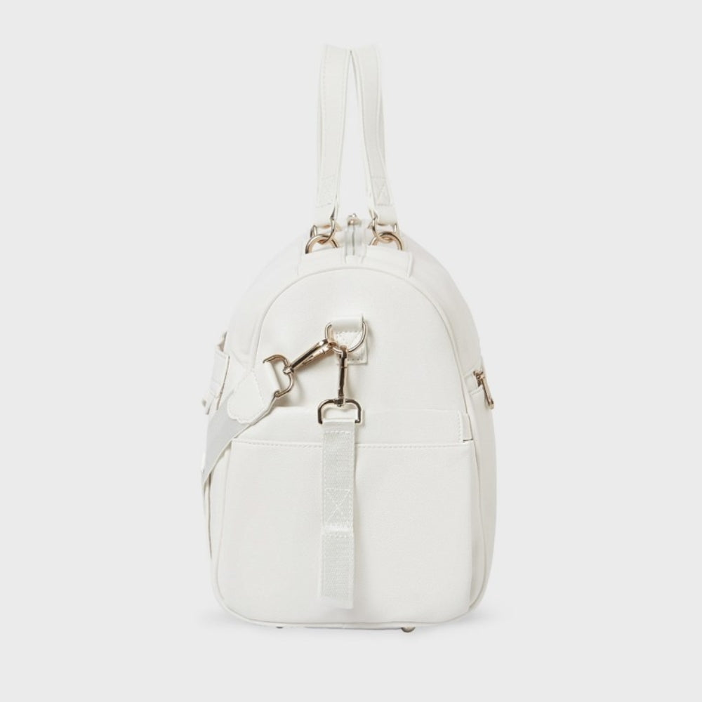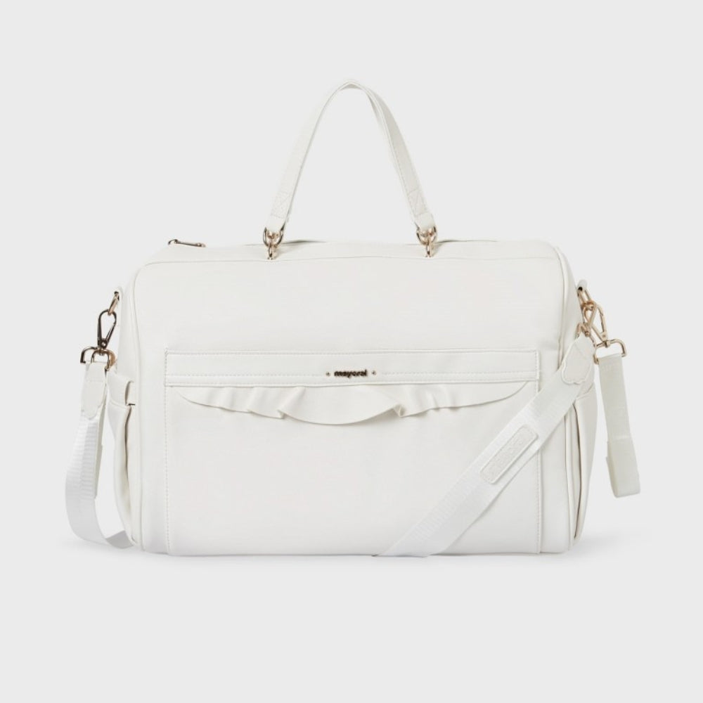 Den krämfärgade väskan från Mayoral är perfekt som baby shower-present.