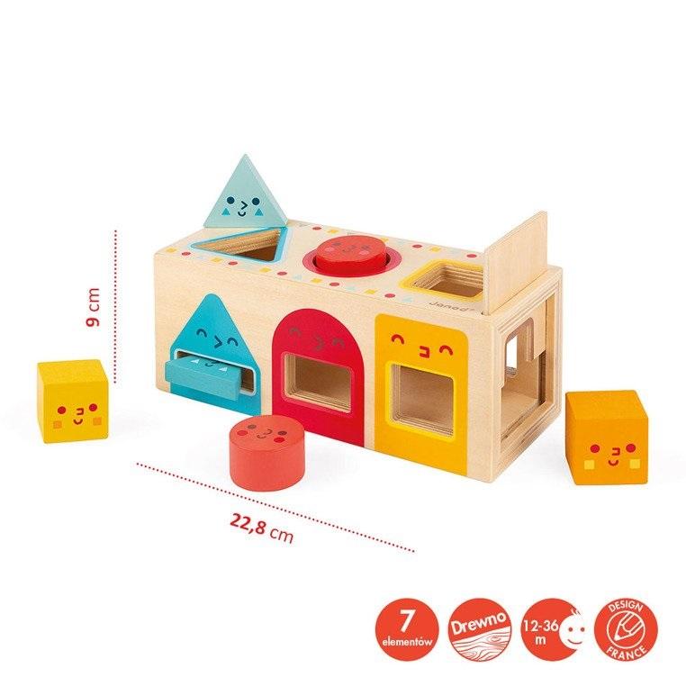 Janod-setet innehåller en låda (sorterare för barn) av trä med hål i olika geometriska former och 6 träklossar.