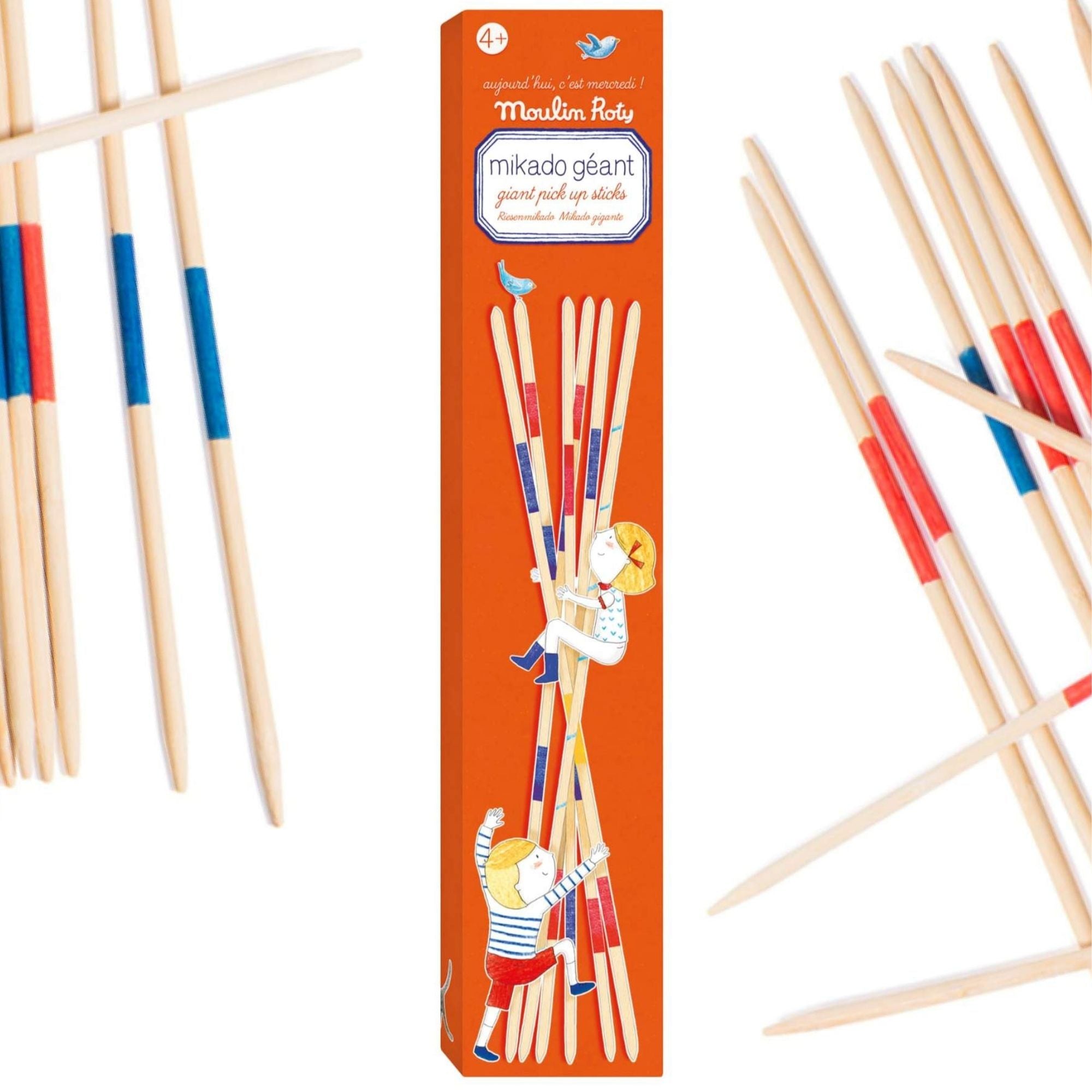 Fingerfärdighetsspelet Mikado Bisks i jätteformat från franska Moulin Roty passar utmärkt för barn över 4 år.