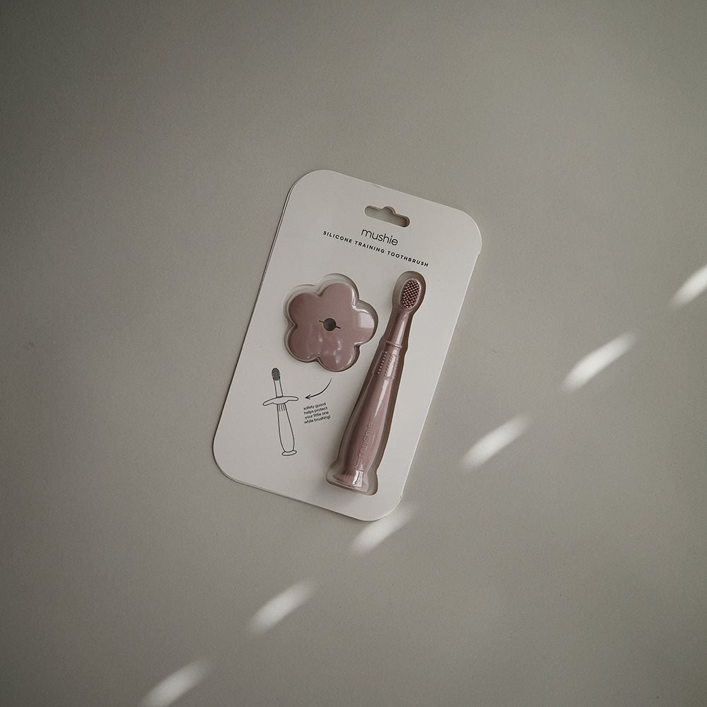 Flower Soft Lilac Infant Toothbrush från Mushie hjälper till med den dagliga skötseln av ditt barns munhygien från 3 månaders ålder.